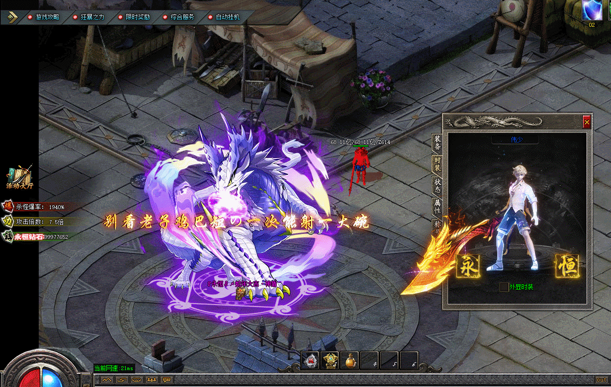 - 【版本说明】: 上线就送MAX刀速+双倍爆率提升.装备嗷嗷全爆.人人土豪装逼又激情!